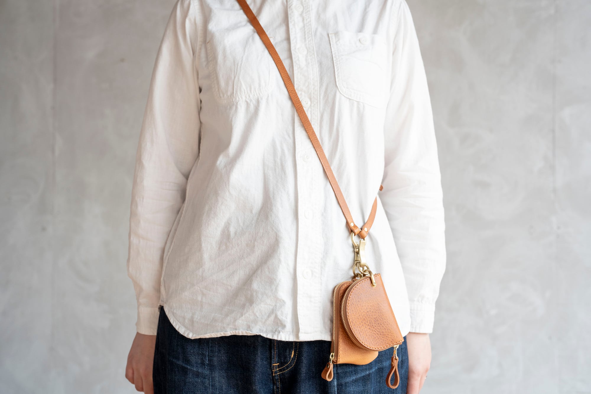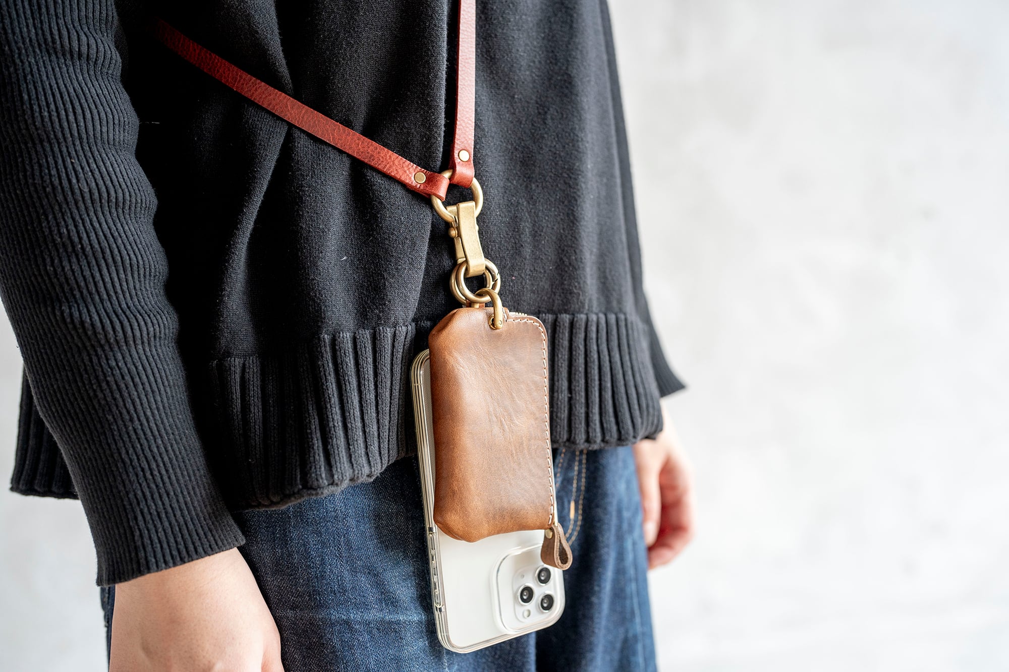 別売りの丸ナスカンとマルチストラップを使うと、肩から掛けてお使いいただけます(写真16~19枚目)